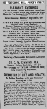 1890 The Temperance Society sells off the old Temperance Hall on Princes Street. It was purchased by the Junior Institute for Working Lads and became a lecture hall, classroom, gymnasium and recreation and reading room