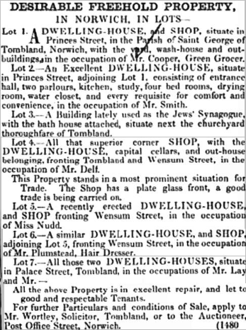 1827 “a freehold dwelling house, lately occupied by Mr Buttifant, and his under-tenants, with a stable and yard adjoining, situate in St George of Tombland, Norwich, fronting Prince’s Street and lying next the Church Alley” for sale