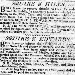 1808 and 1809 announcement in Norfolk Chronicle – Squire & Edwards is Matthew Squire and Henry Edwards.
